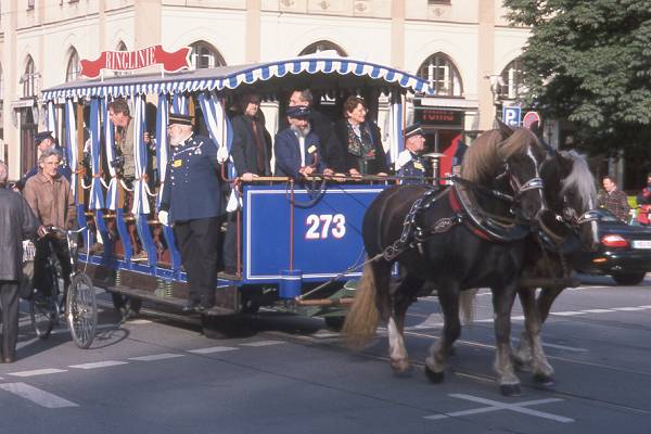 Vorneweg die Prominenz in der Pferdetrambahn,