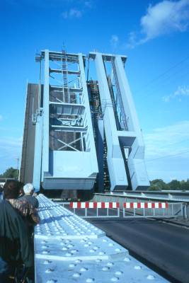 die Klappbrücke. Bahn und Straße sind jetzt unterbrochen, für