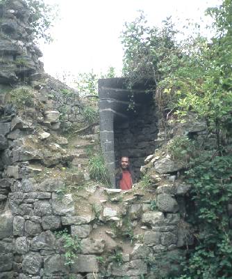 vor uns die Burgruine auf einem Vulkankegel stehen. Der Turm ist mit grünen